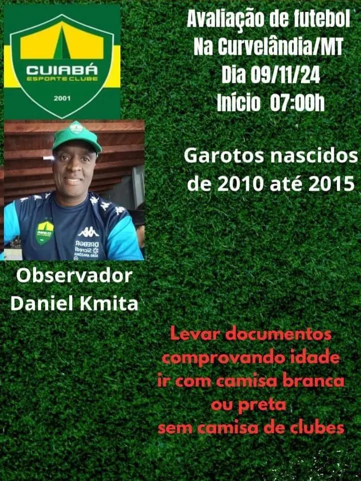 O observador técnico do Cuiabá Esporte Clube, Daniel Kmita, estará em Curvelândia avaliando jovens jogadores nascidos entre 2010 e 2015, da região Oeste de Mato Grosso.