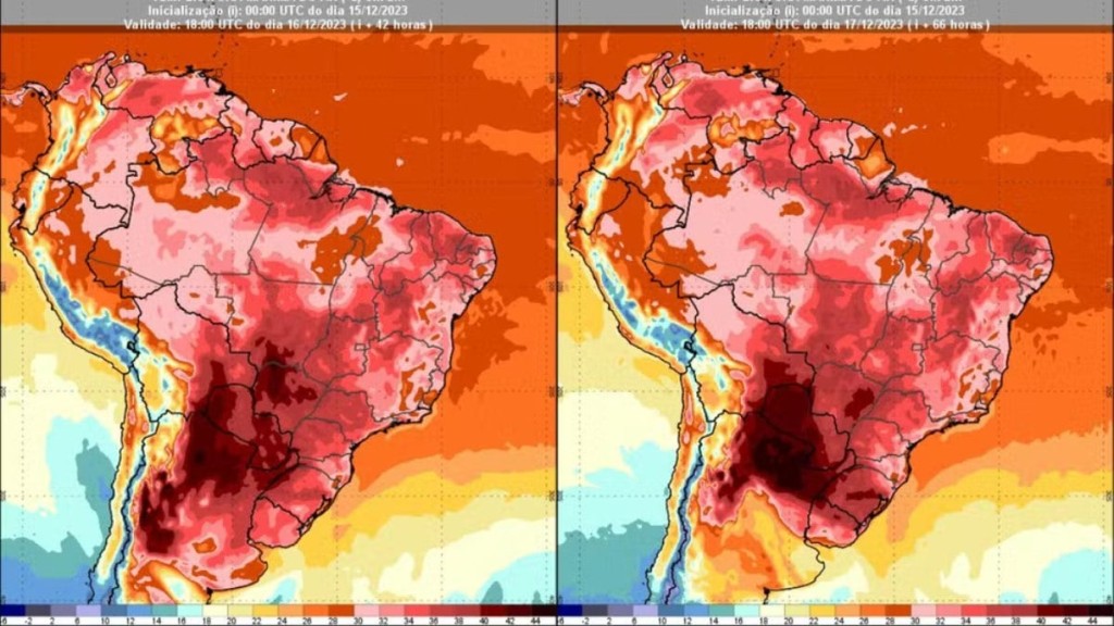 Mapa com distribuição de calor prevista para sábado (16/12) e domingo (17/12)