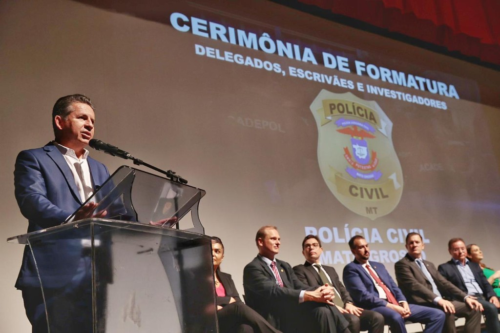 Durante a solenidade de formatura de 313 novos investigadores, escrivães e delegados da Polícia Judiciária Civil (PJC) de Mato Grosso, nesta segunda-feira (11.12), o governador Mauro Mendes enfatizou que o efetivo inicia os trabalhos já com a arma mais moderna do mundo, a pistola Glock, além de uniformes, estrutura e equipamentos de ponta.