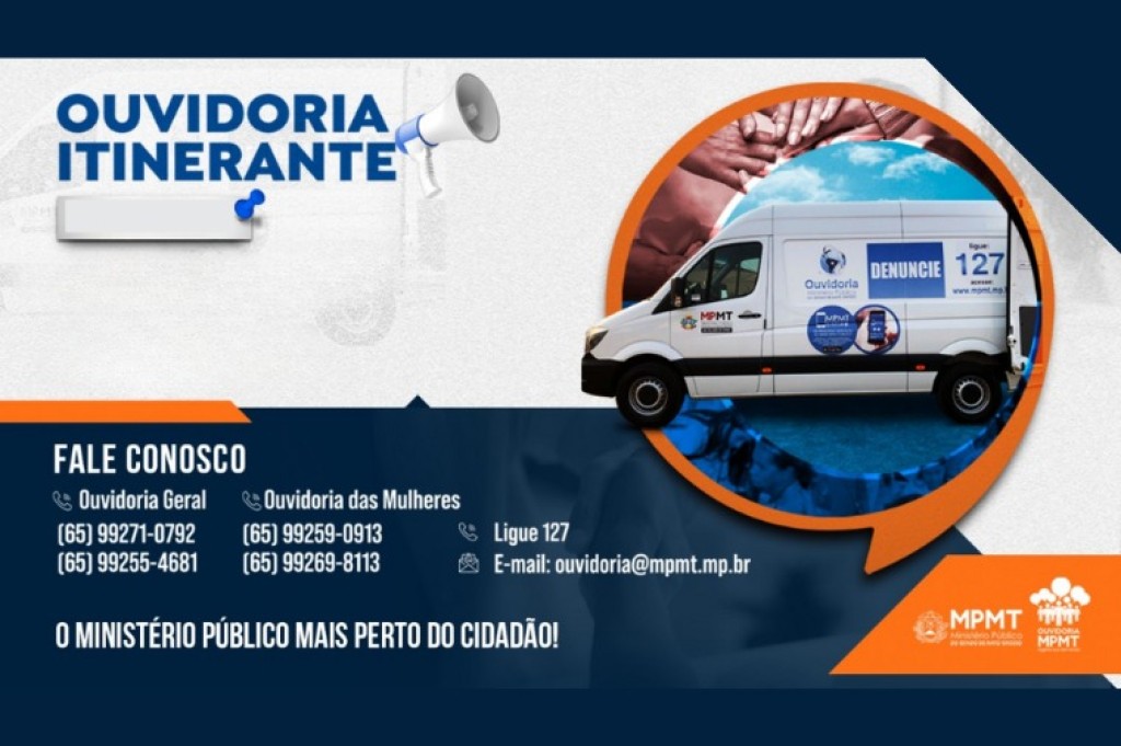 Contato – A Ouvidoria do MPMT tem como missão atender as demandas da sociedade e elevar a transparência do trabalho desenvolvido pela instituição. Além do atendimento itinerante, a população pode acessar o serviço pelo telefone 127 (ligação gratuita), pelo WhatsApp nos números (65) 99259-0913 | 99269-8113 | 99271-0792 | 99255-4681, aplicativo MP Online (disponível para os sistemas operacionais Android e iOS), e-mail ouvidoria@mpmt.mp.br e formulário eletrônico de manifestação (veja aqui). O atendimento presencial na sede da Procuradoria-Geral de Justiça, no Centro Político e Administrativo, ocorre das 8h às 12h e das 14h às 18h, de segunda a sexta-feira.