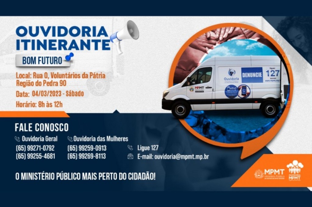 O projeto Ouvidoria Itinerante retoma as atividades esta semana, prestando atendimento aos moradores da comunidade Bom Futuro, na região do Pedra 90, em Cuiabá. A primeira visita ocorre neste sábado (04), das 8h às 12h, com objetivo de levantar as demandas que afetam coletivamente a população relacionadas à saúde, educação, cidadania, segurança, meio ambiente, crianças e adolescentes, idosos, consumidor, pessoas com deficiência, infraestrutura e combate à criminalidade.