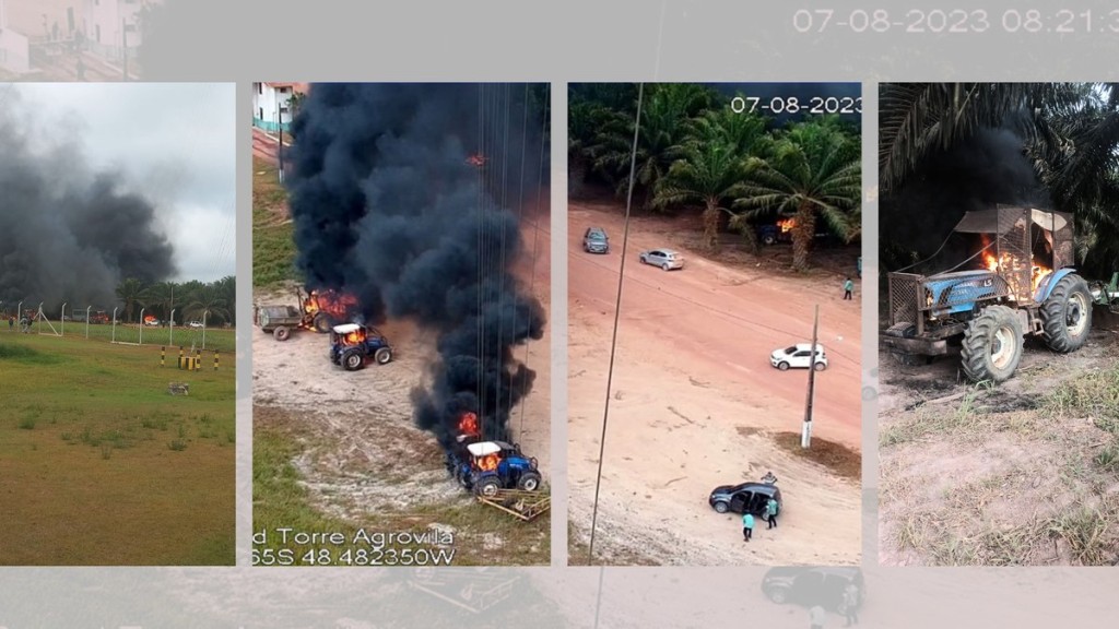 Cúpula da Amazônia: Câmeras registram invasão, depredação e incêndio de tratores da “Brasil BioFuels”, em Tomé-Açu, noroesta do Pará, setor de extração de ‘óleo dendê’ para produção de Biodiesel. Cúpula da Amazônia ocorre em Belém, 200 km de distância da fazenda. pic.twitter.com/PX8qqtgUCL