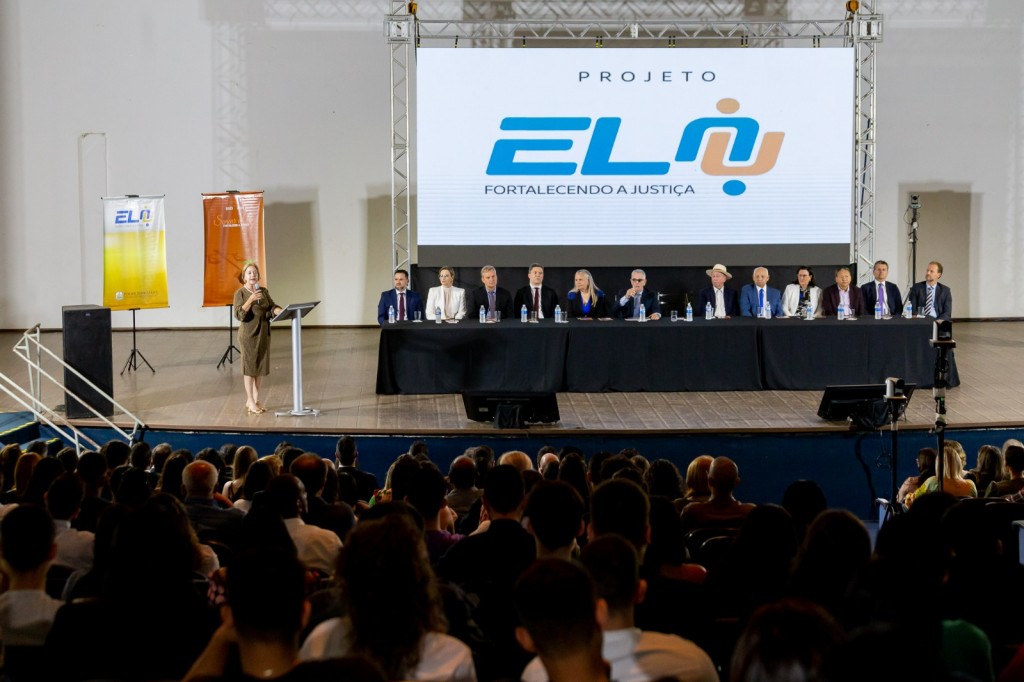 #Paratodosverem – Esta matéria possui recursos de texto alternativo para inclusão das pessoas com deficiência visual. Primeira imagem: fotografia colorida onde aparecem uma mulher ao púlpito e uma mesa de autoridades ao fundo. Atrás deles, um telão onde está escrito “Projeto Elo – Fortalecendo a Justiça”. O auditório aparece repleto de pessoas. Segunda imagem: fotografia colorida do ministro Antônio Palheiro. Ele fala ao microfone no púlpito. É um homem branco, de cabelos brancos e óculos de grau. Usa terno escuro e camisa e gravata azuis. Terceira imagem: fotografia colorida do professor Tiago. Ele é um homem branco, de cabelos e barba claros. Usa terno escuro, camisa azul e gravata listrada. Quarta imagem: print de tela do ministro Herman. Ele é um homem branco, de cabelos loiros e usa óculos de grau. Quinta imagem: fotografia colorida da desembargadora Helena Maria. Ela é uma mulher branca, de cabelos escuros, que fala ao microfone. Usa uma roupa estampada e um casaco branco. Quinta imagem: fotografia colorida da desembargadora Clarice. Ela fala ao microfone no púlpito. É uma mulher branca, de cabelos claros. Usa um vestido marrom e colar de pérolas.
