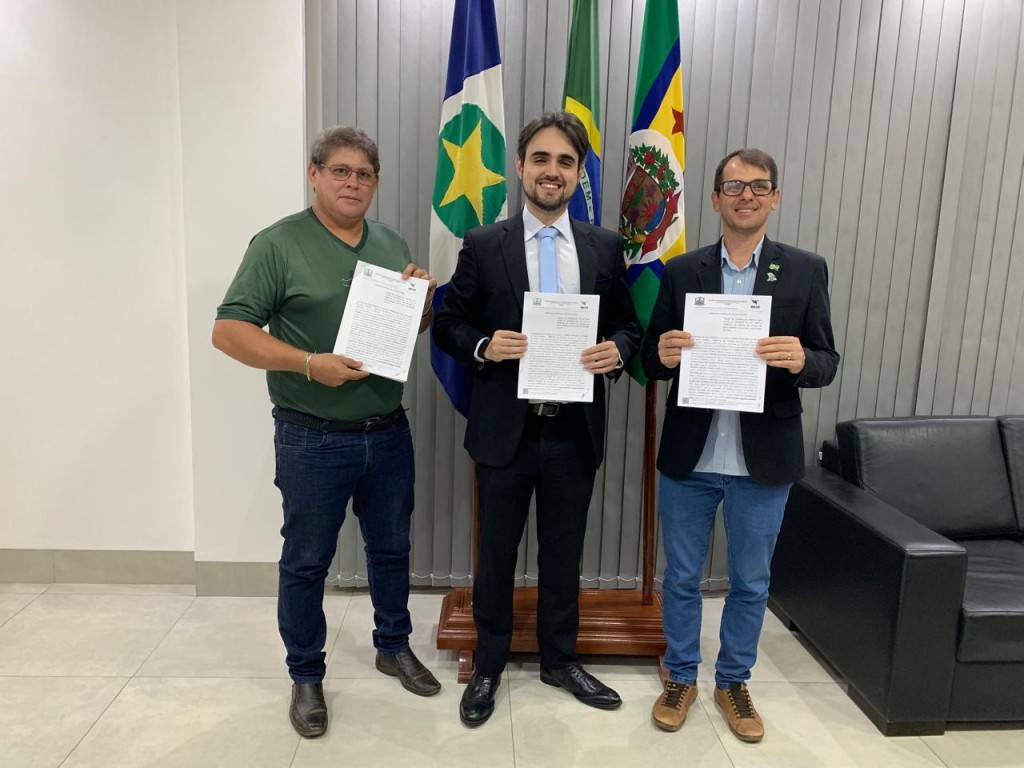 Esta matéria possui recursos de texto alternativo para promover a inclusão das pessoas com deficiência visual. Primeira imagem: Foto colorida de três homens, que estão em pé, um ao lado do outro, segurando uma folha de papel e sorrindo para a câmera. O primeiro homem, da esquerda para a direita, é o secretário de Educação e Cultura de Juína, Ericson Leandro Oliveira. O segundo é o coordenador do Cejusc, juiz Patrick Coelho, e o terceiro é o prefeito de Juína, Paulo Veronese. Eles estão numa sala com carpet bege claro e sofá preto. Atrás deles estão as bandeiras de Mato Grosso, do Brasil e de Juína.