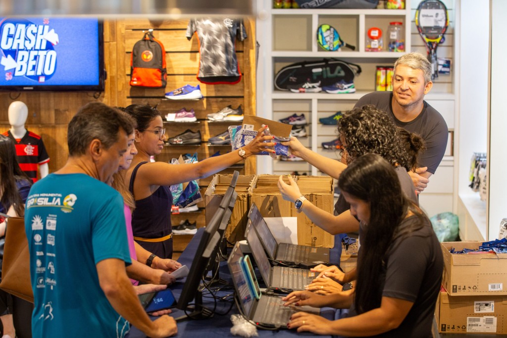 Esta matéria possui recursos de texto alternativo para promover a inclusão das pessoas com deficiência visual. Imagem 1: foto horizontal colorida de pessoas na loja retirando os kits. Diante de uma bancada com computadores, atendentes mexem nos computadores e uma entrega o kit a uma mulher. Os clientes estão do outro lado da bancada, entre eles Willians, que está de costas de camiseta azul. Ao fundo há artigos esportivos expostos. Imagem 2: foto horizontal colorida da servidora Isabela, em primeiro plano. Ela é uma mulher jovem branca, com cabelos lisos castanhos, olhos castanhos, veste blusa azul, uma corrente dourada e olha para a câmera. Ao fundo, desfocado, há tênis expostos.Imagem 3: foto horizontal colorida da juíza Renata Evaristo com seu kit na mão, em pé, segura o kit com as duas mãos, olha para a direita e sorri. Ela é uma mulher, está com o cabelo preso, usa brinco de pérola e uma camisa de seda com estampa floral rosa e pérolas. Ao fundo, desfocado, há artigos esportivos e uma televisão ligada.