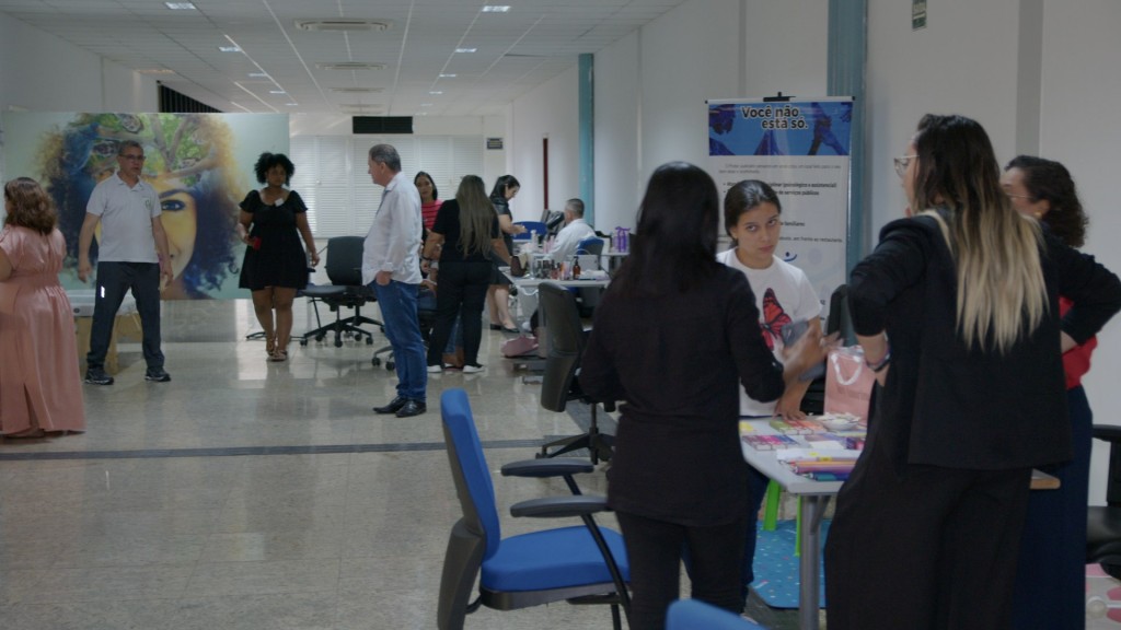Esta matéria possui recursos de texto alternativo para promover a inclusão das pessoas com deficiência visual. Descrição da imagem: Foto 1: Espaço do fórum de Cuiabá com mesas onde são oferecidos os serviços. Várias mulheres estão em pé, conversando. Foto 2: Imagem fechada onde aparecem duas mulheres de mãos dadas. Elas estão uma de frente apra outra. Foto 3: Juíza Ana Graziela. Ela é uma mulher branca, loira, de cabelos compridos. Ela concede entrevista para a TV.Jus onde aparece o microfone preto. Ela usa um blaser claro e uma blusa roxa.