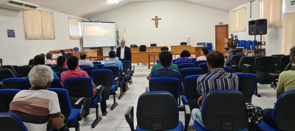 Descrição das imagens: Imagem 1: Foto horizontal colorida. Juiz Darwin de Souza Pontes faz uso da palavra, no auditório do fórum. A frente do juiz, plateia formada por homens.