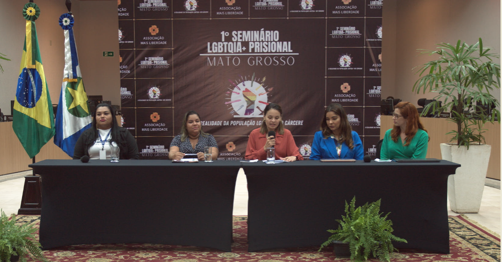 #ParaTodosVerem – Esta matéria possui recursos de texto alternativo para promover a inclusão das pessoas com deficiência visual. Foto horizontal colorida com as integrantes da Mesa 2 de debate. Cinco mulheres estão sentadas na mesa do dispositivo de palestrantes, com um painel ao fundo com quadrados onde são exibidas a logomarca do organizador, a Associação Mais Liberdade, e logos do evento. Ao centro está escrito “1º Seminário LGBTQIA+ Prisional”. A mediadora Patrícia Bachega fala ao microfone enquanto lê papéis. Há um tapete no chão do plenária, plantas à frente e ao fundo e dois mastros com as bandeiras de Mato Grosso e do Brasil.