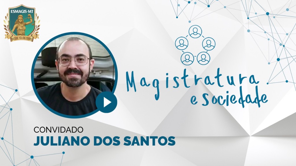 Este post possui recursos de texto alternativo para promover a inclusão das pessoas com deficiência. Fotografia quadrada e colorida. Na lateral esquerda o logo da Esmagis-MT. Na parte superior central o logo do Programa Magistratura e Sociedade e a foto do convidado, com o texto: Convidado: Juliano dos Santos.