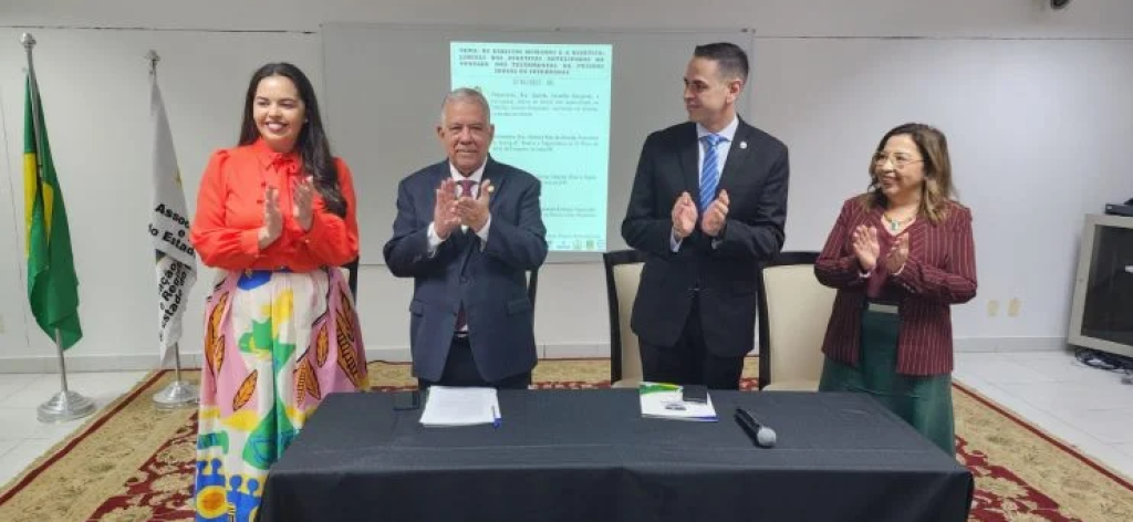 Esta matéria possui recursos de texto alternativo para promover a inclusão das pessoas com deficiência visual. Descrição das imagens: Foto1 – quatro pessoas estão em pé, atrás de uma mesa e batem palmas. Todas sorriem. Ao fundo, bandeiras do Brasil e do Judiciário. Foto 2 – Mulher vestida de vermelho, usa cabelos pretos e compridos. Ela fala ao microfone. Ao fundo, bandeira de Mato Grosso.