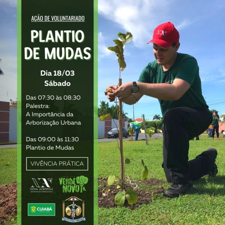Descrição da imagem: arte gráfica digital feita em cima de uma foto em que um homem está amarrando uma planta a um talo para que ela fique em pé. Ele está agachado em um gramado, veste blusa verde e boné vermelho com a logo da Nova Acrópole. Acompanha a imagem o texto: ação de voluntariado plantio de mudas dia 18/03 sábado das 7:30 às 08:30 palestra: A importância da arborização urbana das 9:00 às 11:30 plantio de mudas vivência prática. Assinam a peça os logos da Nova Acrópole, Verde Novo, Prefeitura de Cuiabá e Poder Judiciário de Mato Grosso.