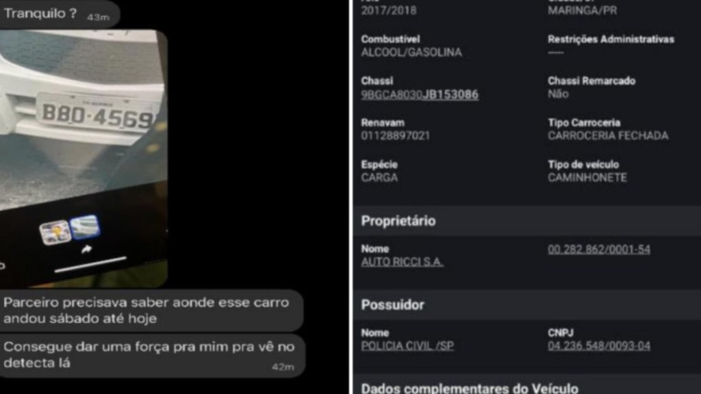 Em resposta, o outro homem envia uma imagem ao suspeito com todas as informações do veículo que aparece como propriedade da Polícia Civil, se tratando de uma viatura policial descaracterizada.