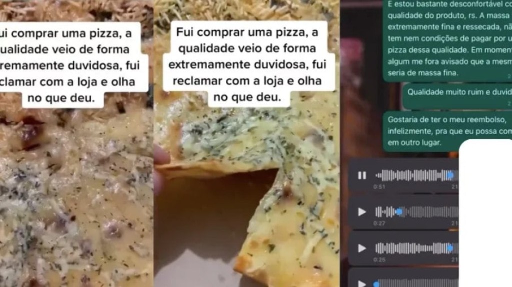 Em resposta, a empreendedora enviou áudios chamando o cliente de mal-educado, entre outras ofensas e dizendo de forma incisiva que ele fosse até a loja buscar o dinheiro de volta. Ela defendeu o produto, afirmando que a massa fina seria parte do conceito da pizza.