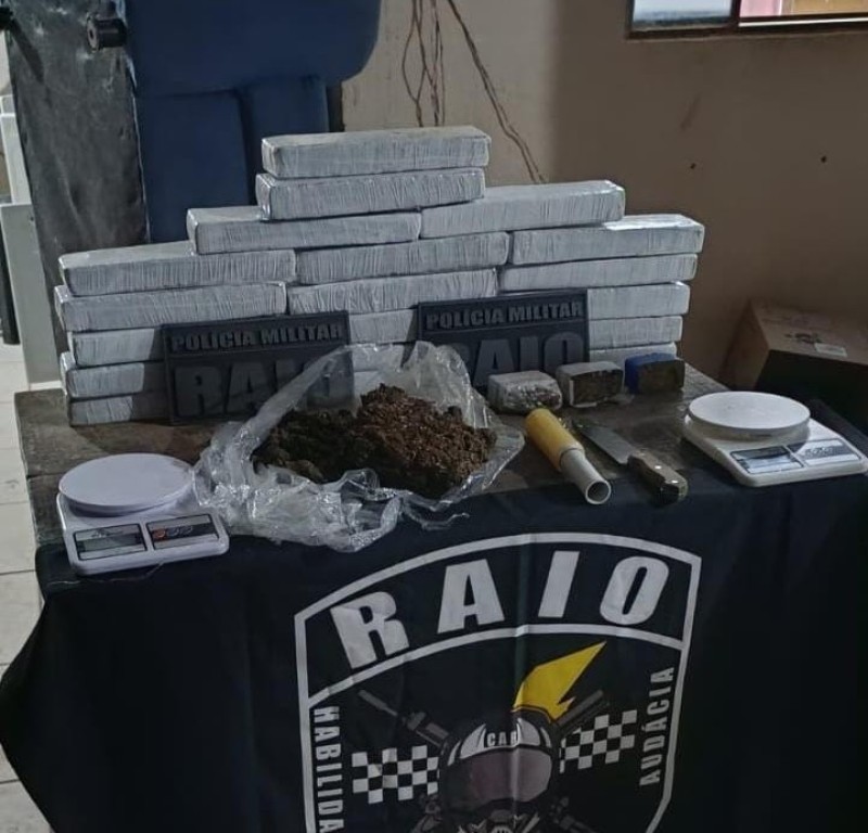 No interior do imóvel, outros três homens foram detidos em flagrante por tráfico de drogas. Os policiais apreenderam outros 18 tabletes de maconha e diversas porções do mesmo entorpecente, além de uma porção de skank, três balanças de precisão, quatro aparelhos celulares e uma motocicleta.