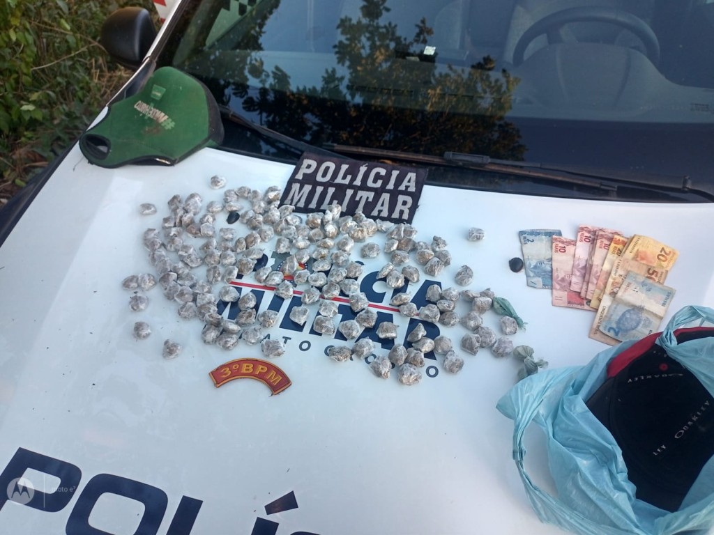 No procedimento de abordagem, o menor tentou fugir e dispensou uma sacola, mas foi detido rapidamente. Em revista pessoal, foi localizada a quantia de R$ 200,00 em dinheiro. Já em verificação à sacola jogada pelo suspeito, a PM contabilizou 152 porções de substância análoga a maconha e duas porções de cocaína.