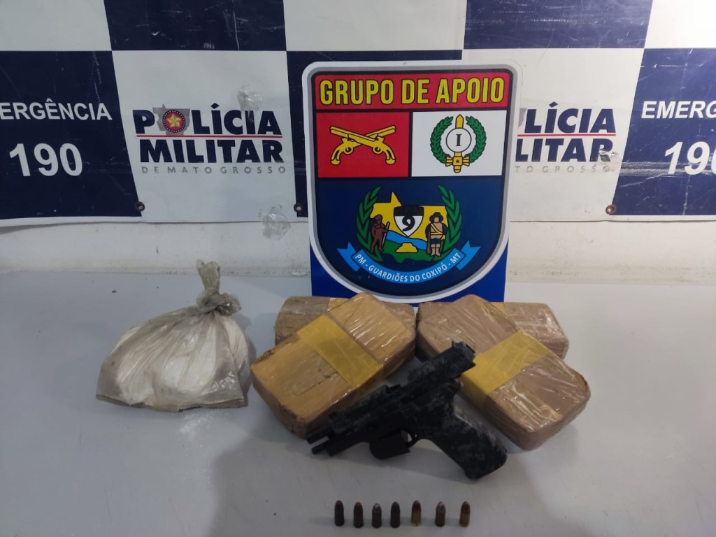 Policiais militares do 9º Batalhão prenderam, na noite desta quinta-feira (01.06), um casal por tráfico ilícito de drogas e porte ilegal de arma de fogo, no bairro Vila Rosa, em Cuiabá. Na ação, foram apreendidos quatro tabletes de cocaína, uma porção do mesmo entorpecente, uma pistola nove milímetro, um carregador e sete munições.