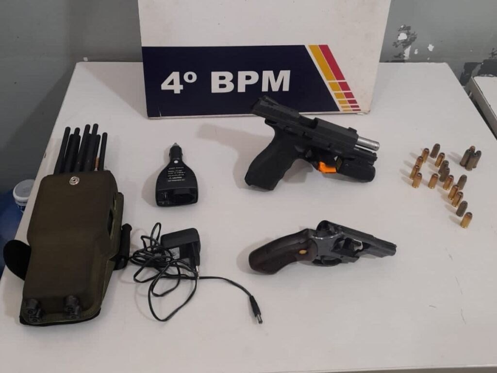 De imediato, os policiais militares se deslocaram até o endereço informado e encontraram os suspeitos, que prontamente se renderam. Em revista pessoal, a equipe localizou duas armas de fogo, sendo um revólver calibre .38 e uma pistola calibre .40, ambos municiados.