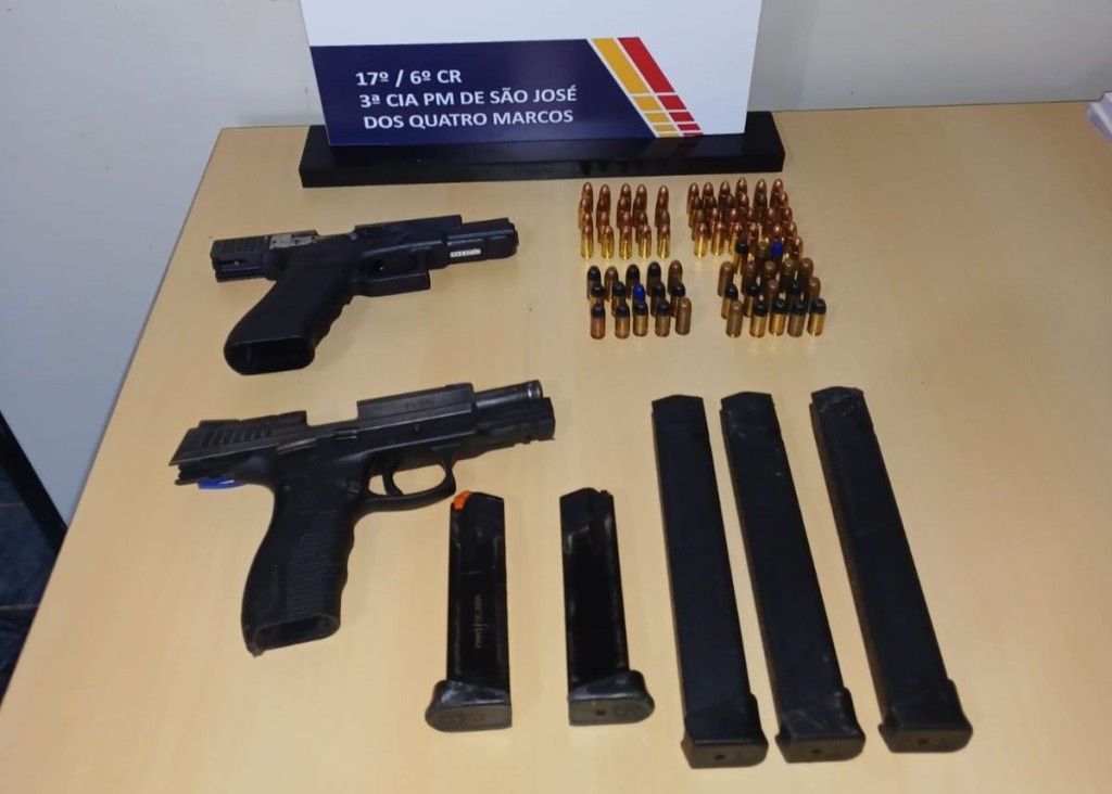 Policiais militares do município de São José dos Quatro Marcos prenderam dois homens, de 22 e 23 anos, pelos crimes de porte ilegal de arma e direção perigosa, na manhã desta segunda-feira (10.04). Com a dupla foram apreendidas duas pistolas e 78 munições para o armamento.