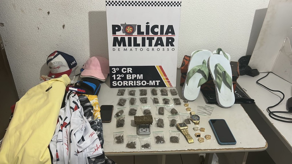 Os policiais militares se deslocaram até a residência e realizaram buscas na casa, com autorização da denunciante. No quarto do adolescente, foram encontrados seis porções de maconha, além de roupas, bonés, relógios e anéis sem procedência.