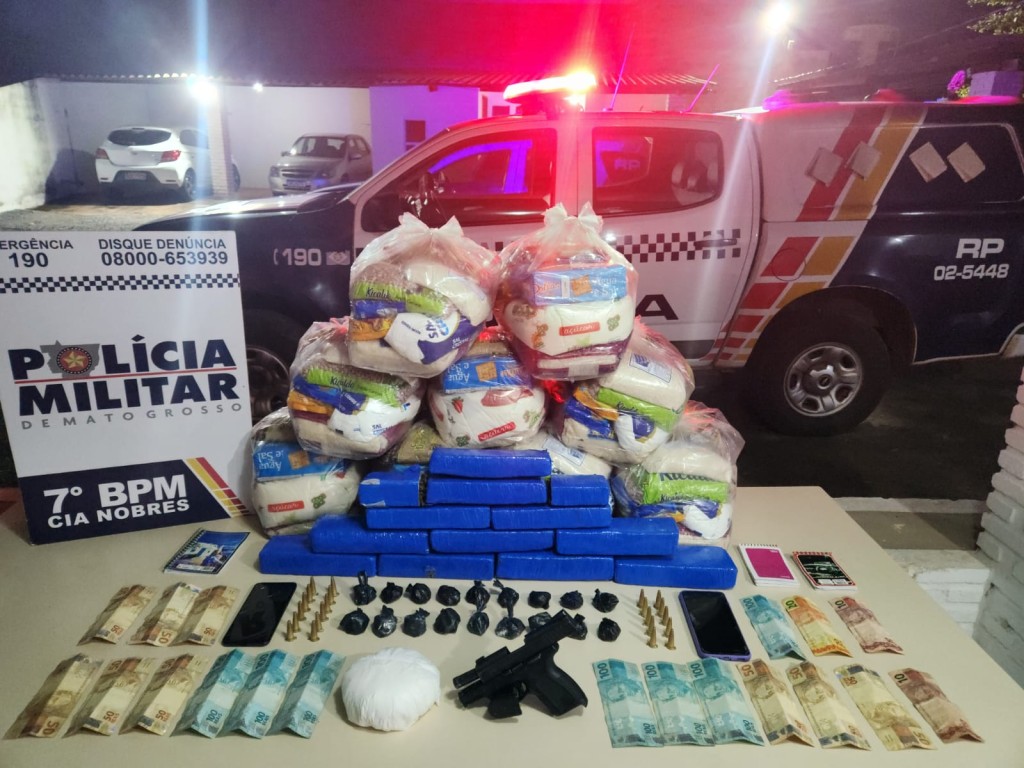 Policiais militares de Nobres prenderam um homem de 32 anos por tráfico de drogas e porte ilegal de arma, na noite desta quarta-feira (27.09). Na ação, a PM apreendeu uma arma de fogo, 11 tabletes e porções de maconha e cocaína e cestas básicas que pertenciam a uma organização criminosa.