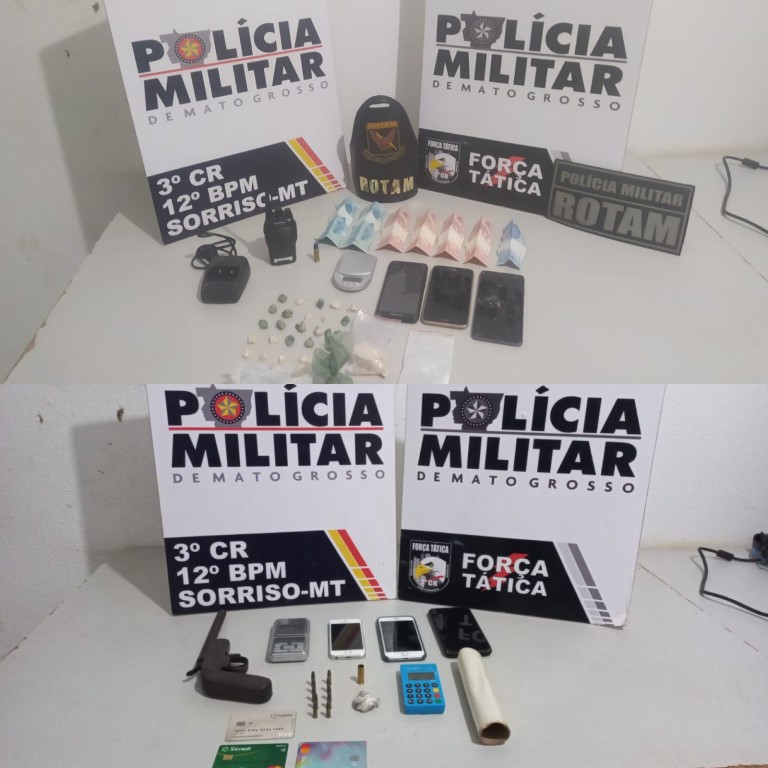 Policiais militares de Sorriso prenderam três homens em flagrante por porte ilegal de arma de fogo e tráfico ilícito de drogas, na noite desta quarta-feira (29.03). As prisões foram registradas durante duas ocorrências e, com os suspeitos, a PM apreendeu uma arma de calibre .22, munições e porções de entorpecentes.