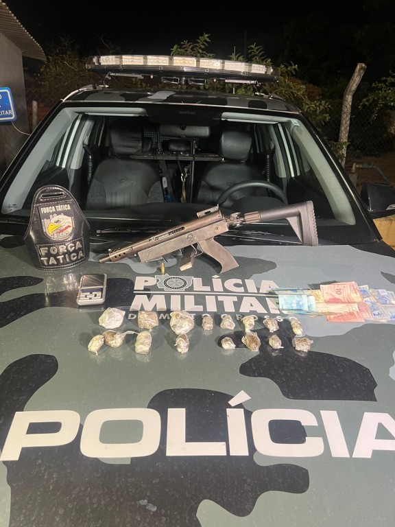 Policiais militares da Força Tática apreenderam, na noite desta quarta-feira (07.08), uma submetralhadora calibre nove milímetros e 16 porções de substância análoga à maconha no bairro Jardim Marajoara, em Várzea Grande. Três homens foram presos em flagrante por associação criminosa, porte ilegal de arma de fogo e tráfico de drogas ilícitas.