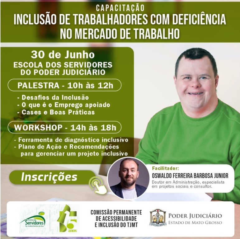 Será realizada nesta sexta-feira (30 de junho), às 10h, a “Capacitação de Inclusão no Trabalho de Pessoas com Deficiência”, promovida pela Comissão Permanente de Acessibilidade e Inclusão do Tribunal de Justiça de Mato Grosso, na Escola dos Servidores, em Cuiabá.