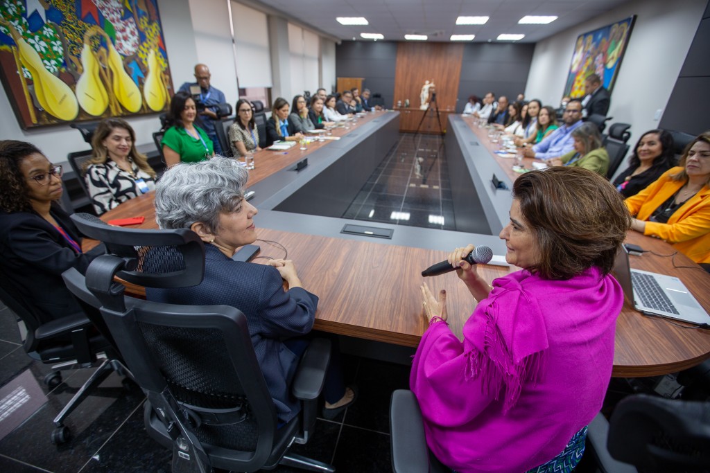 Esta matéria possui recursos de texto alternativo para promover a inclusão das pessoas com deficiência visual. Foto 1: A imagem panorâmica mostra a sala de reuniões da presidência e numa grande mesa em U, com todos os participantes da reunião. São cerca de 25 pessoas. Em primeiro plano estão sentadas e de costas para a câmera, a palestrante Keitlin e a juíza Viviane Rebello, coordenadora do Núcleo de Sustentabilidade. Foto 2: a imagem mostra a palestrante falando ao microfone. Ela é uma mulher branca, cabelos escuros e tem uma echarpe pink nos ombros. Ela está sendo assistida pela juíza Viviane, que é uma mulher branca de cabelos curtos e grisalhos e pela gestora do núcleo, Vera Lícia, que é uma mulher negra, cabelos curtos e escuros e usa óculos.