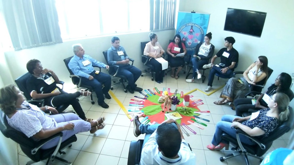 Primeira imagem: participantes sentados em cadeiras, formando um círculo.