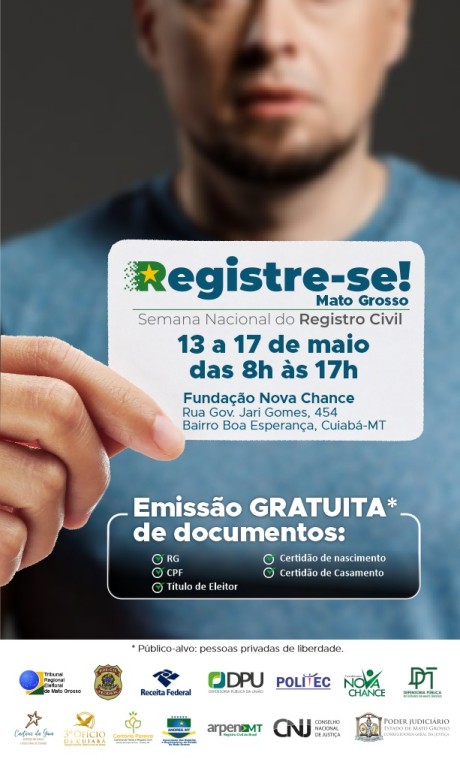Segunda imagem: cartaz da campanha Registre-se para ação em Cuiabá. Com o fundo desfocado vemos um homem usando uma camiseta azul e no primeiro plano, a mão dele segurando um cartão com as informações da data, horário, local e documentos que serão emitidos.