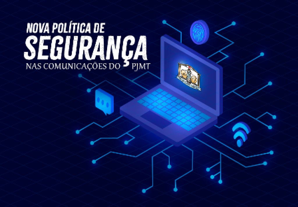 Primeira imagem: Design gráfico em tons de azul, com itens e objetos pequenos relacionados à tecnologia e segurança, como uma impressão digital biométrica, sinal de Wi-Fi e balão de diálogo. Ao centro um notebook com a marca do Poder Judiciário de Mato Grosso. Todos os elementos estão interligados por terminações eletrônicas. Na parte superior esquerda está a frase: ‘Novas Políticas de Segurança nas Comunicações do PJMT.