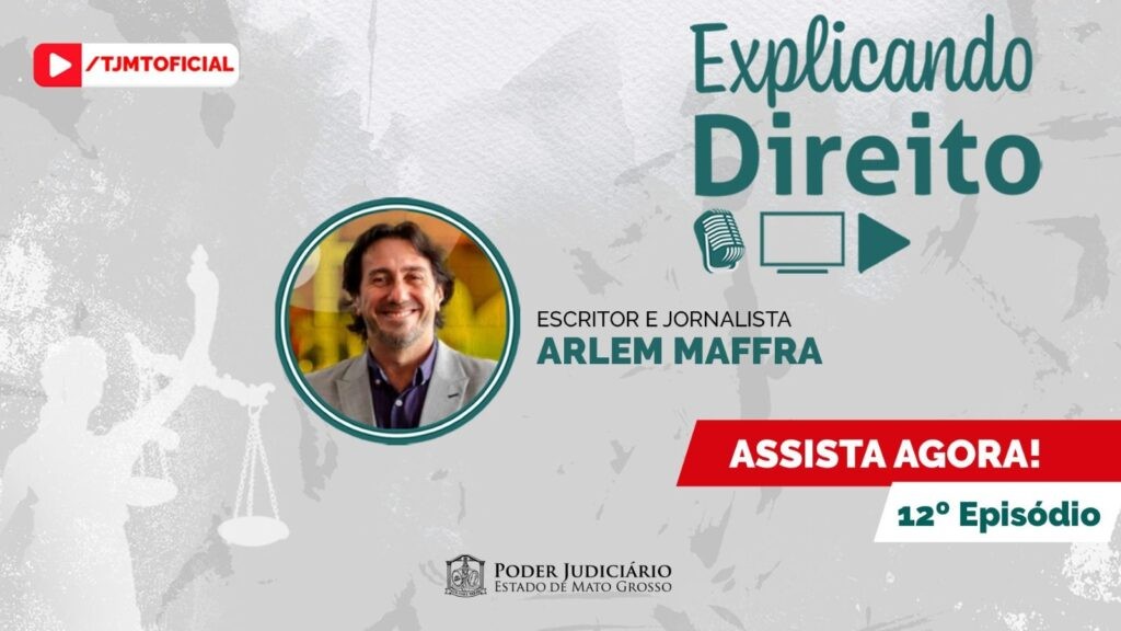 ParaTodosVerem: Esse post possui recursos de texto alternativo para promover a inclusão das pessoas com deficiência. Fotografia quadrada e colorida. Na lateral esquerda o ícone de play acompanhado do texto: /tjmtoficial. Na parte superior central o logo do Programa Explicando Direito, a foto do convidado: Arlem Maffra, acompanhados do texto: Escritor e jornalista Arlem Maffra. Assista agora! 12º Episódio. Assina a peça o logo do Poder Judiciário de Mato Grosso.