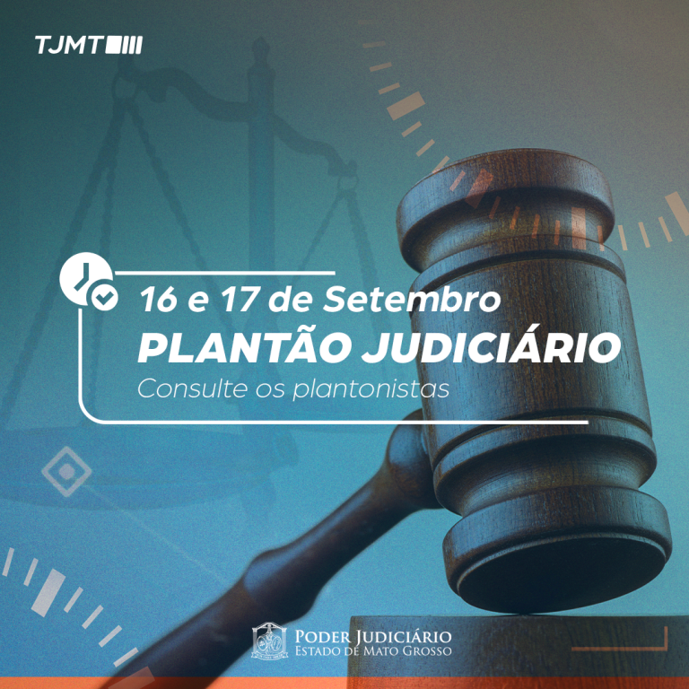 #ParaTodosVerem: Esse post possui recursos de texto alternativo para promover a inclusão das pessoas com deficiência. Descrição da imagem: Fotografia colorida. Ao fundo a sombra da balança da justiça e um malhete de madeira. Acompanha o texto: 16 e 17 de Setembro – Plantão Judiciário | Consulte os plantonistas. Assina a peça o logo do Poder Judiciário do Estado de Mato Grosso.