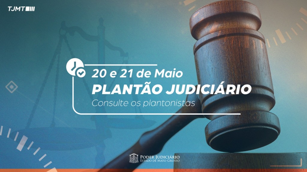 #ParaTodosVerem: Esse post possui recursos de texto alternativo para promover a inclusão das pessoas com deficiência. Descrição da imagem: Fotografia colorida. Ao fundo a sombra da balança da justiça e um malhete de madeira. Acompanha o texto: 20 e 21 de Maio – Plantão Judiciário | Consulte os plantonistas. Assina a peça o logo do Poder Judiciário do Estado de Mato Grosso.