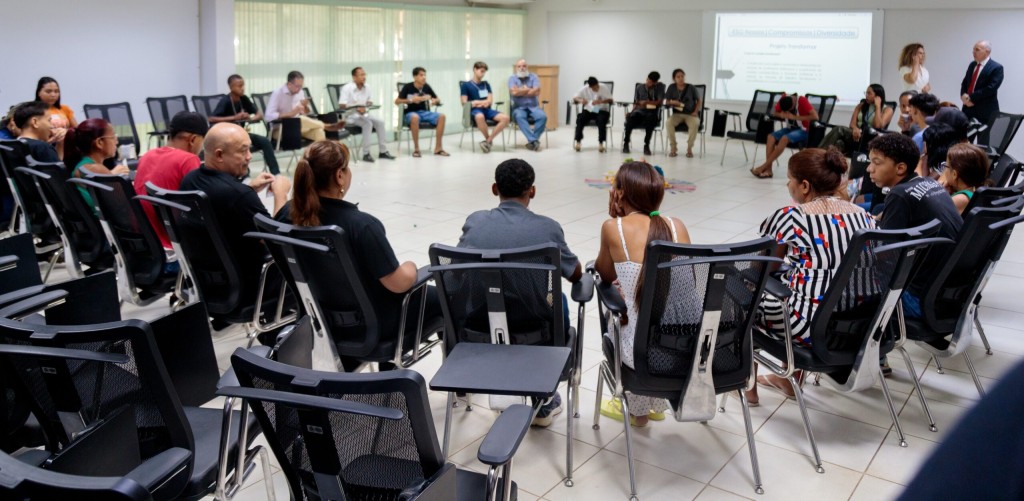 Esta matéria possui recursos de texto alternativo para promover a inclusão das pessoas com deficiência visual. Imagem 1: foto horizontal colorida dos adolescentes e suas famílias em círculo, sentados em cadeiras pretas, em uma sala da Escola dos Servidores do Poder Judiciário. I