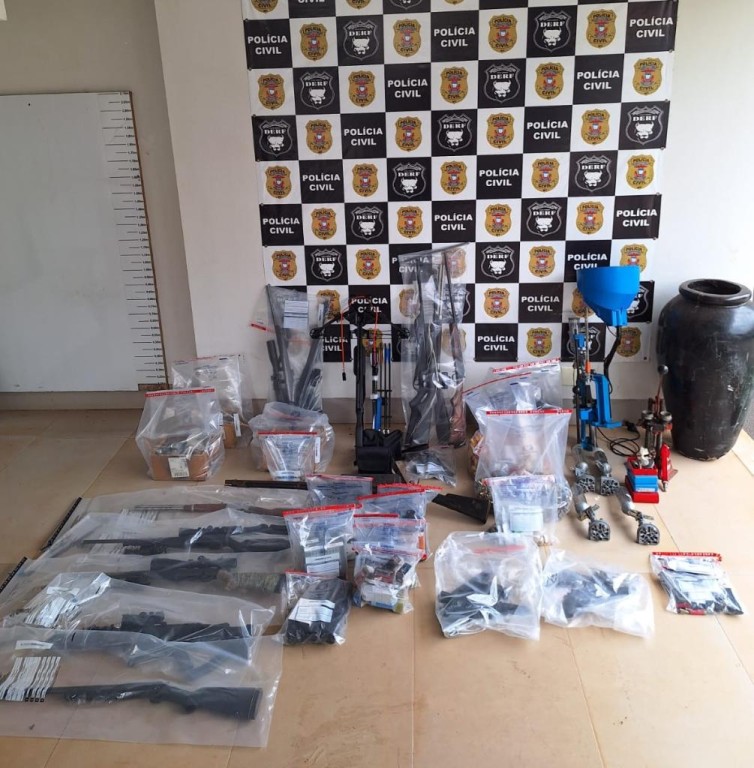 A ação resultou na prisão em flagrante de um homem, de 46 anos, pelo crime de posse ilegal de munição de uso restrito, e na apreensão de 7 revólveres, 10 armas longas e 3 pistolas, além de grande quantidade de munições e equipamentos relacionados à fabricação e recarga de munições.