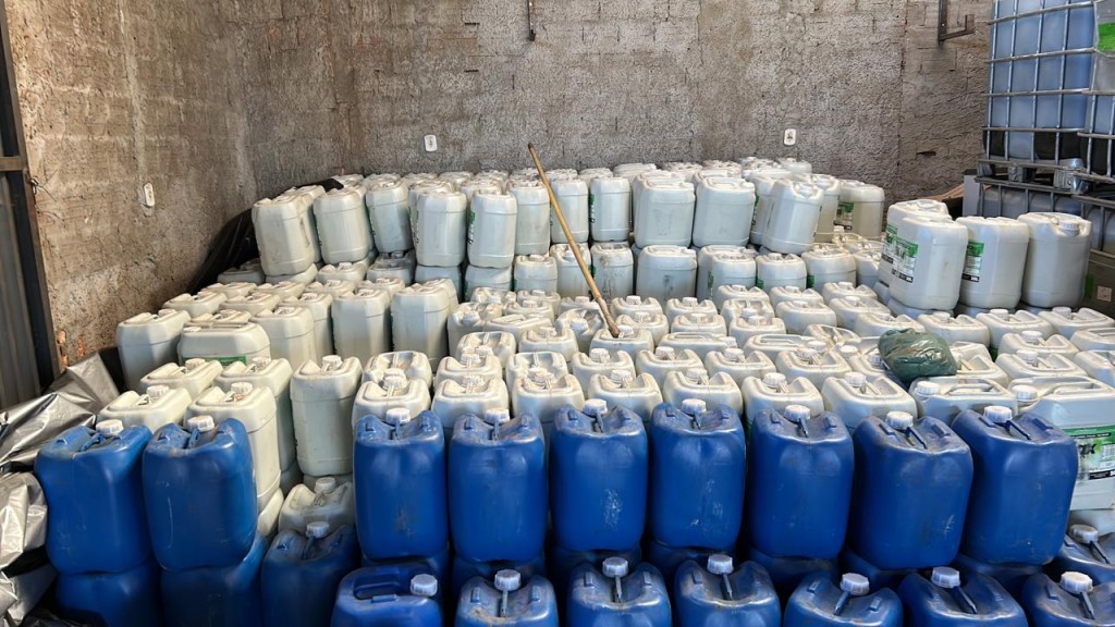 Segundo informações, no local funcionava uma serralheria e um casal estava locando parte do espaço para armazenar os produtos de origem ilícita. Com base nas informações, os policiais da Derf, com apoio do órgão que faz o monitoramento da cidade por meio de câmeras, foi possível identificar o barracão, onde foram apreendidos aproximadamente 400 galões de 20 litros de defensivos.