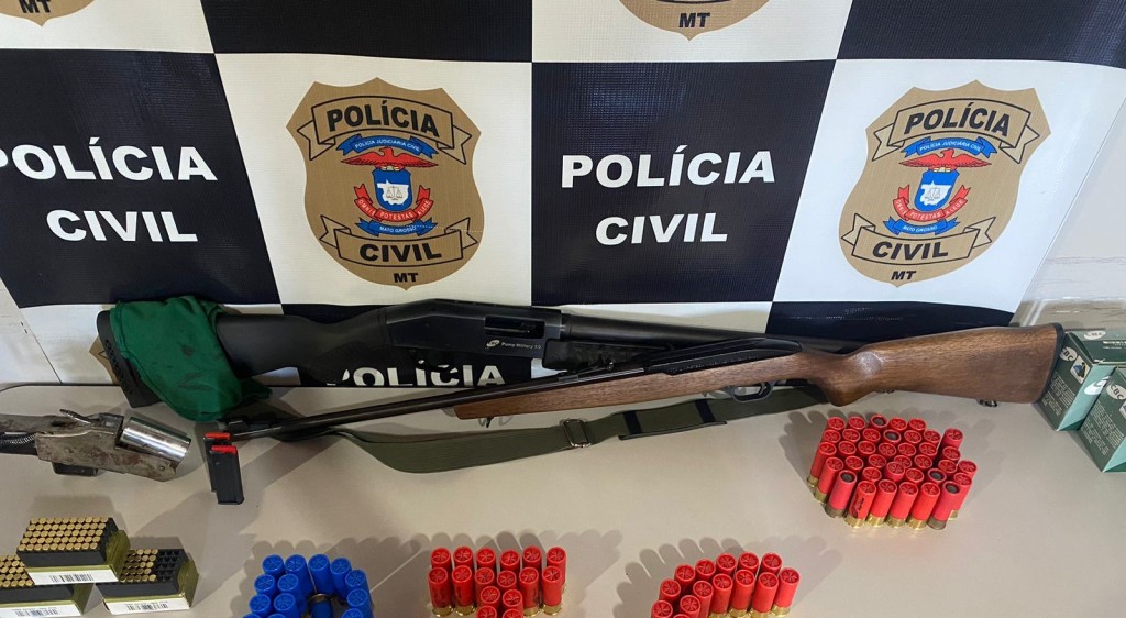 Armas e munições foram apreendidas pela equipe da Delegacia da Polícia Civil de Campos de Júlio em uma investigação para apurar o crime de disparo de arma de fogo ocorrido em maio deste ano, em uma via pública do município.