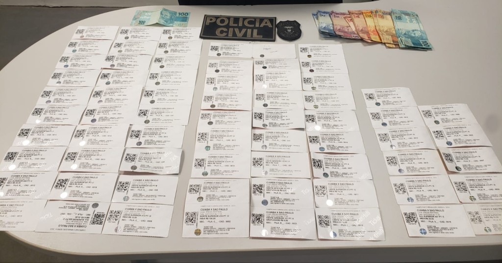 Com os dois homens, foram apreendidos 77 ingressos para a partida entre as equipes do Cuiabá e do São Paulo e mais de R$ 700,00 em dinheiro.