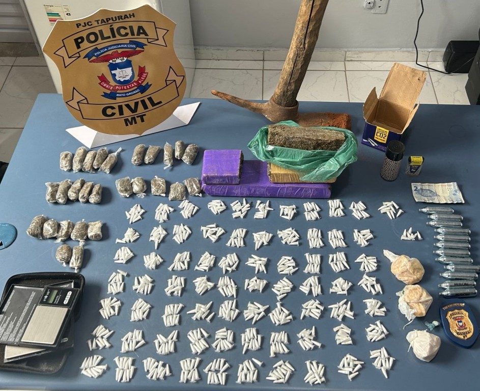 A Delegacia de Tapurah desarticulou, na manhã de segunda-feira (08.04), um depósito de drogas na cidade. No lote abandonado, os policiais civis localizaram enterrados em baldes, 718 pinos de cocaína, 27 porções e outros quatro tabletes de maconha e quatro porções de pasta base de cocaína, além de duas balanças de precisão.