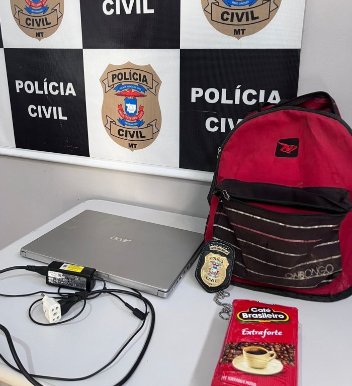 Durante as diligências os policiais civis identificaram o criminoso, que acabou sendo surpreendido em sua residência. Na abordagem foi encontrada uma mochila com o notebook, a extensão e o pacote de café.