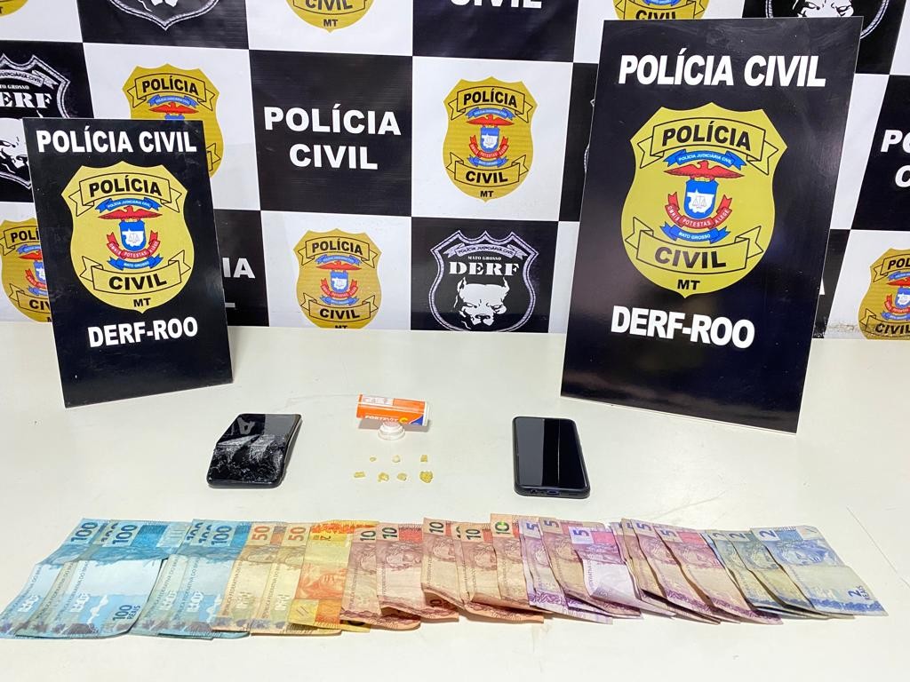 A ação da Delegacia Especializada de Roubos e Furtos (Derf) de Rondonópolis, resultou na apreensão de várias porções de pasta base de cocaína, quase R$ 850 em dinheiro trocado, e dois aparelhos celulares.
