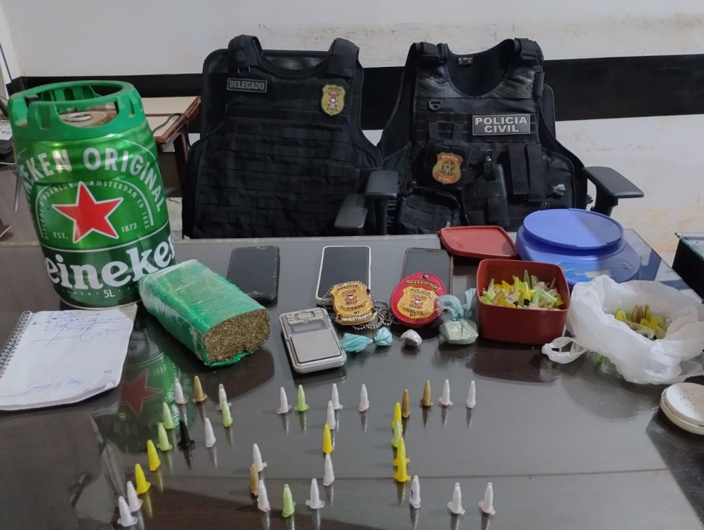 No local foram apreendidas 35 porções de cocaína, um tablete de maconha, duas balanças de precisão, porção de pasta base, um galão contendo moedas, aparelhos celulares, materiais para o tráfico, entre outros itens.