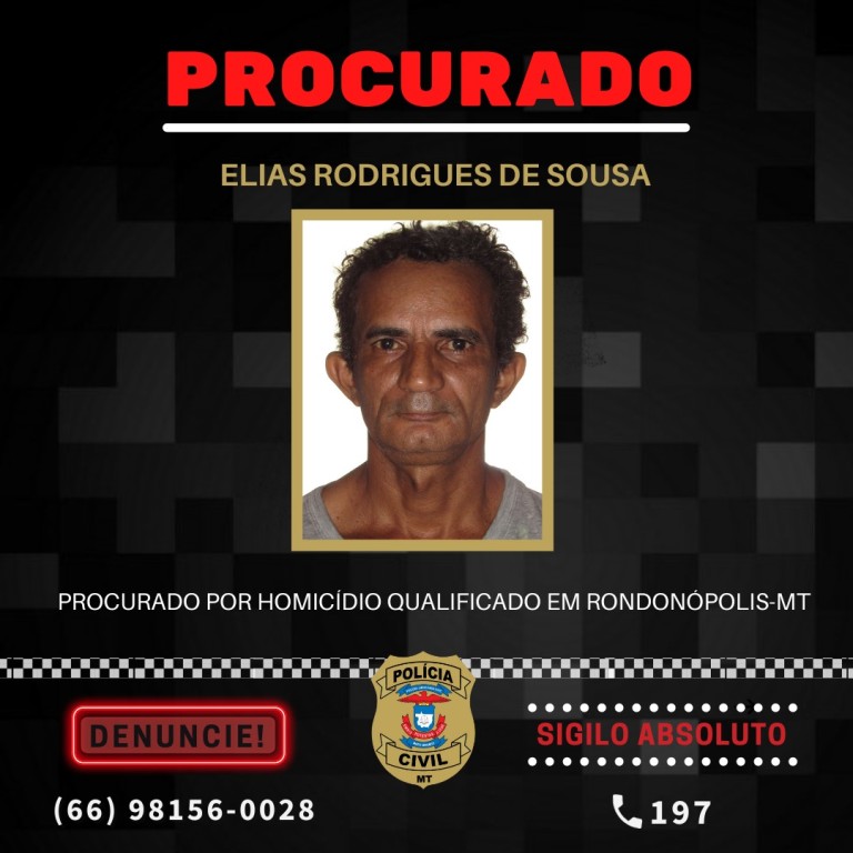 Elias Rodrigues é considerado foragido e quem tiver alguma informação que possa levar a seu paradeiro pode entrar em contato pelos telefones 197 ou (66) 98156-0028. Será preservado o sigilo absoluto das informações.