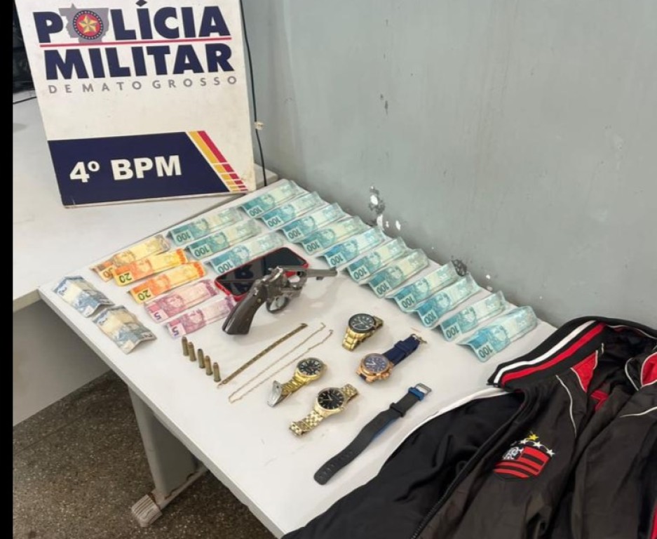 Com um dos suspeitos, os militares encontraram uma arma de fogo tipo revólver, calibre .38, com cinco munições intactas. As equipes ainda recuperaram R$ 1,5 mil em espécie, quatro relógios, uma corrente e uma pulseira das vítimas.