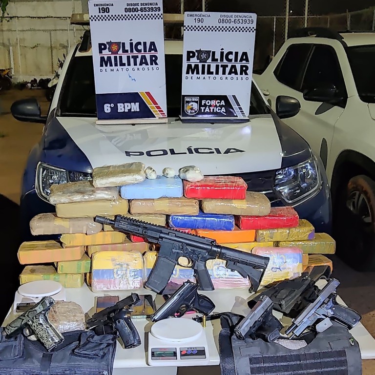 Equipes do 6º Batalhão da Polícia Militar e da Força Tática do 6º Comando Regional apreenderam 34 tabletes de entorpecentes, um fuzil e quatro pistolas, na noite desta quinta-feira (03.10), no município de Cáceres.