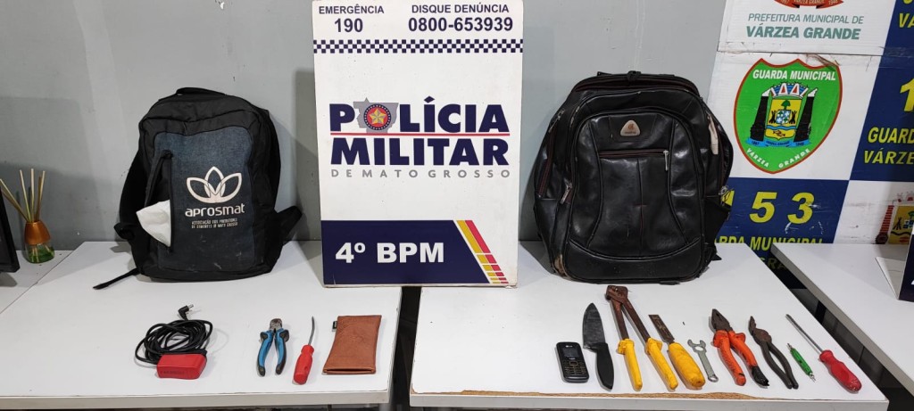 Policiais militares do 4º Batalhão frustraram uma tentativa de furto em um estabelecimento e prenderam dois homens, de 20 e 42 anos, na madrugada desta quarta-feira (29.03), em Várzea Grande. Com os suspeitos foram apreendidas duas mochilas contendo ferramentas que estavam sendo utilizadas na ação criminosa.