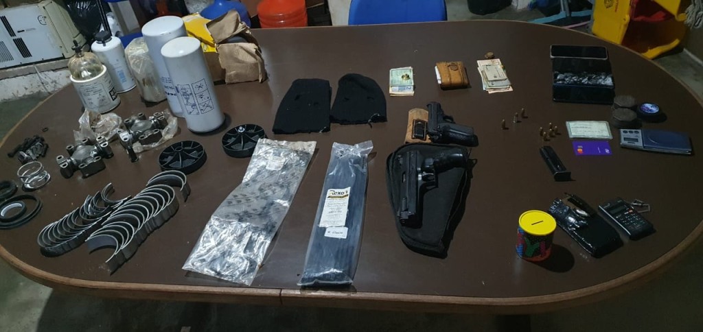 Diante da situação, os militares adentraram a residência e encontraram uma caixa contendo diversas peças de caminhão, uma arma airsoft, munições de calibre 9mm, porções de maconha e quantia de mais de R$ 1 mil em dinheiro.