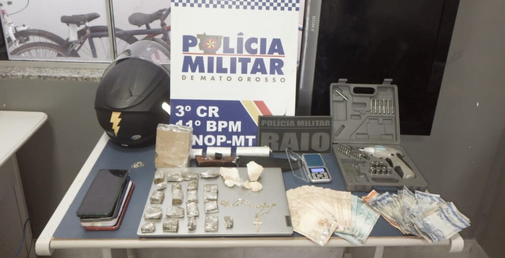 Foram apreendidos R$ 3,4 mil em espécie, 26 porções e um tablete de maconha, uma porção de pasta base de cocaína, um conjunto de parafusadeira, televisão, notebook, faca e uma motocicleta.