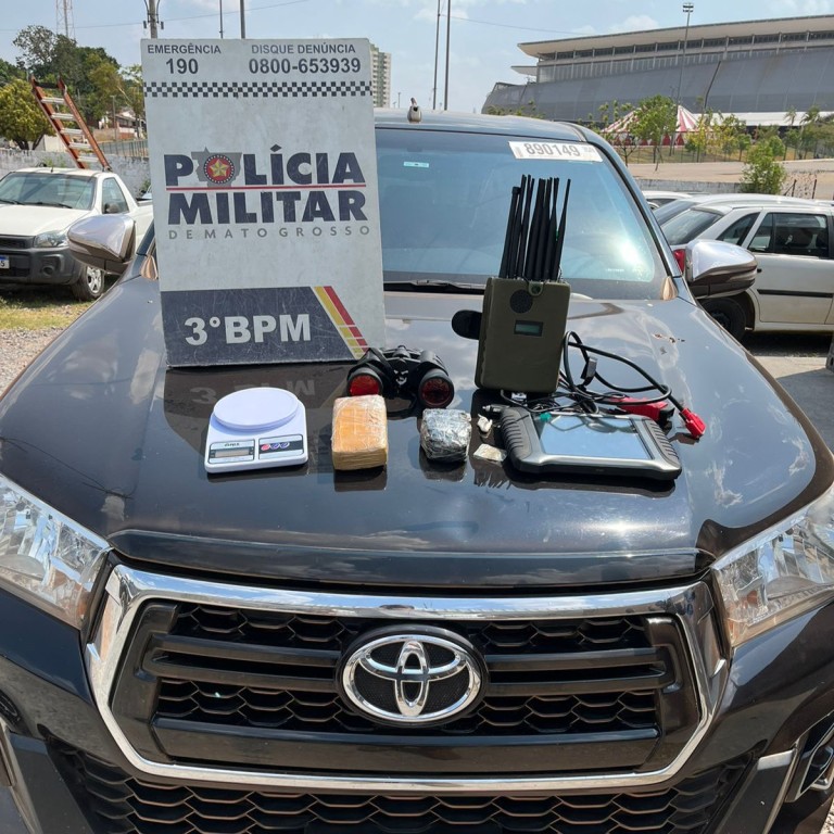 Na busca veicular, a equipe do 3º BPM localizou um aparelho bloqueador de sinal de carros e um aparelho utilizado para dar partida em caminhonetes. Também com a dupla, um tablete e meio e porções de maconha foram apreendidas.